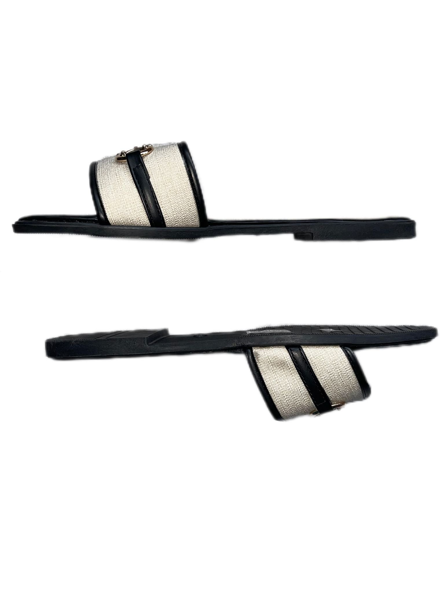 Step into timeless elegance with our Classic Horsebit Linen Slide Sandals. Designed with a minimalist aesthetic, these sandals showcase a neutral linen upper contrasted by sleek black trim and an eye-catching gold horsebit embellishment — a nod to classic equestrian style. The cushioned faux leather insole offers lasting comfort, while the flat sole makes them perfect for both casual outings and polished daywear. Whether you're pairing them with linen trousers or a summer dress, these sandals are a must-have staple for your warm-weather wardrobe.